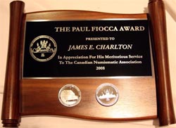 Paul Fiocca was publisher of Canadian Coin News from 1989 until his retirement, remaining a supporter of Canadian numismatics and giving freely of his own time and expertise. He served as editor of The CN Journalfor a number of years, and was serving the RCNA in that capacity at the time of his death in 2007. The award that bears his name is funded by donations from Trajan Publishing Corporation and others that were his friends.